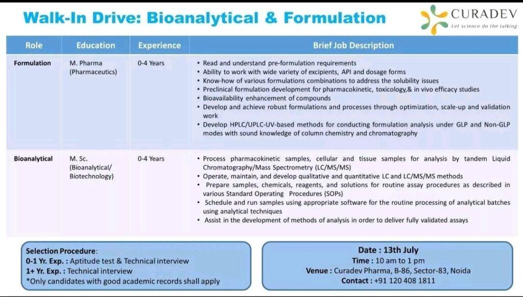 Curadev Pharma Pvt. Ltd, We are hiring! We are actively looking for passionate Freshers & Experienced Candidates for our Formulation & Bioanalytical department on 13th July’ 2023 at Noida