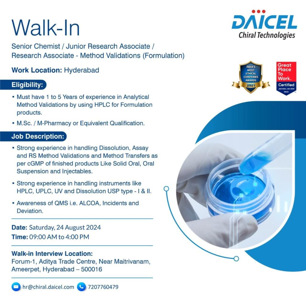 Exciting career opportunities await at Daicel Chiral Technologies! We’re hosting a Walk-In Interview in Hyderabad for roles in Method Validations (Formulation) on 24th August 2024. If you have 1-5 years of experience in HPLC method validations, we’d love to meet you.