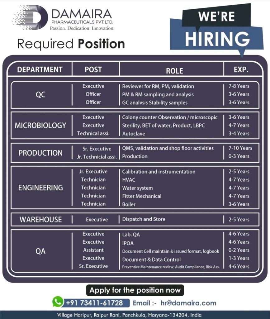 DAMAIRA PHARMA MULTIPLE OPENING FOR QC, MICROBIOLOGY, PRODUCTION, ENGINEERING, WAREHOUSE, QA DEPARTMENT