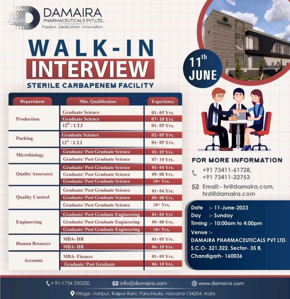 DAMAIRA PHARMA – Walk In Interview for Production, Packing, Microbiology, QA, QC, Engineering, HR, Accounts on 11-June-2023