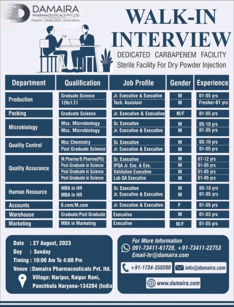 Damaira Pharmaceuticals Pvt. ltd Walk In Drive on 27 August, 2023(Sunday) | Production, Packing, Microbiology, Quality Control, Quality Assurance, Human Resource, Accounts, Warehouse, Marketing