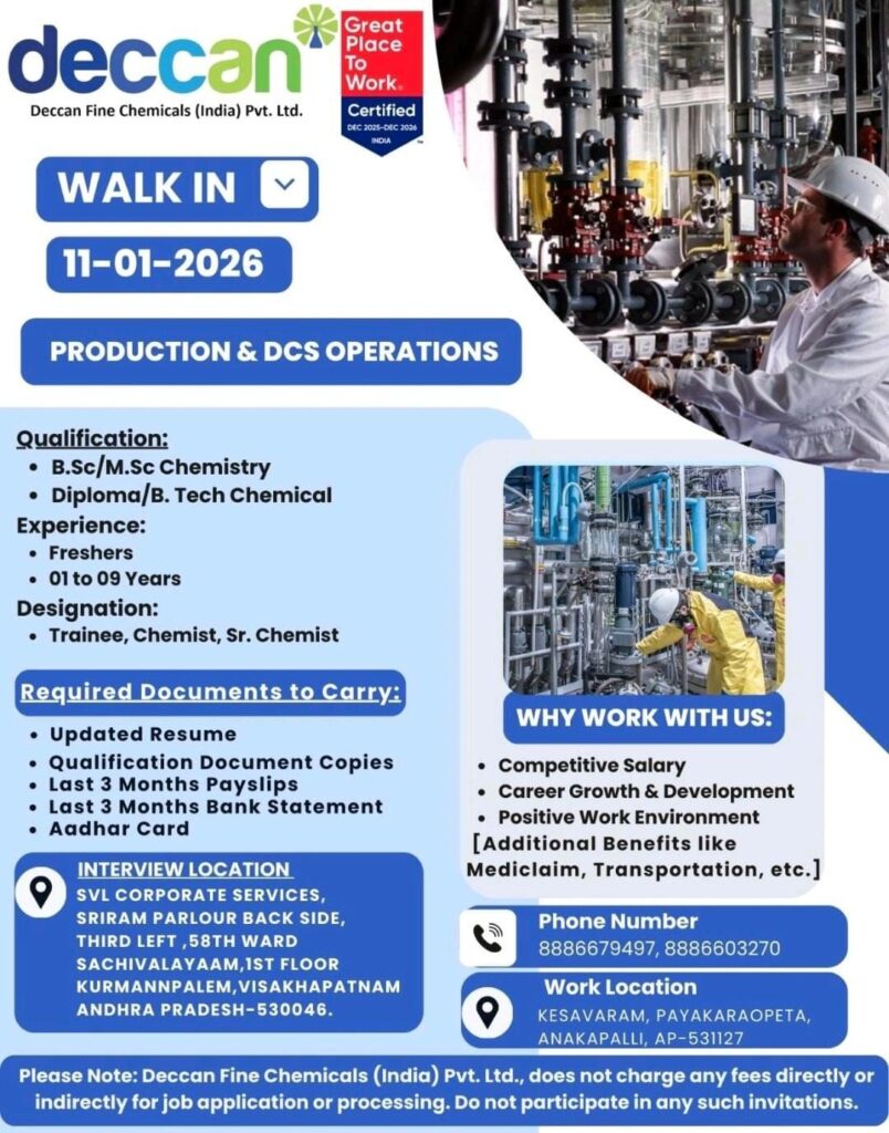 Are you looking to kickstart or advance your career in the chemical manufacturing industry? Deccan Fine Chemicals (India) Pvt. Ltd., a certified “Great Place to Work,” has announced an upcoming walk-in interview drive for various positions in Production and DCS Operations.