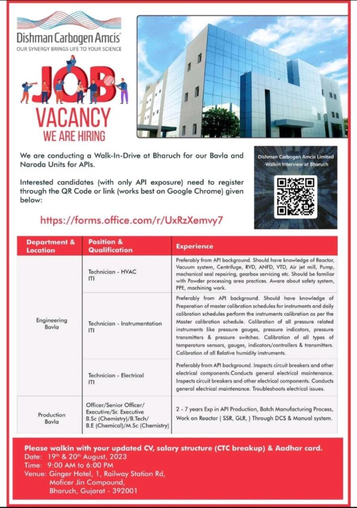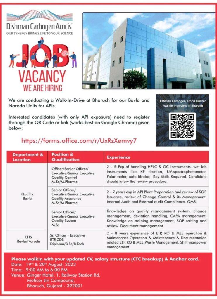 Dishman Carbogen Amcis- Job vacancy for Production, Engineering, Quality, EHS|Walk In Interview on 19th & 20th August, 2023