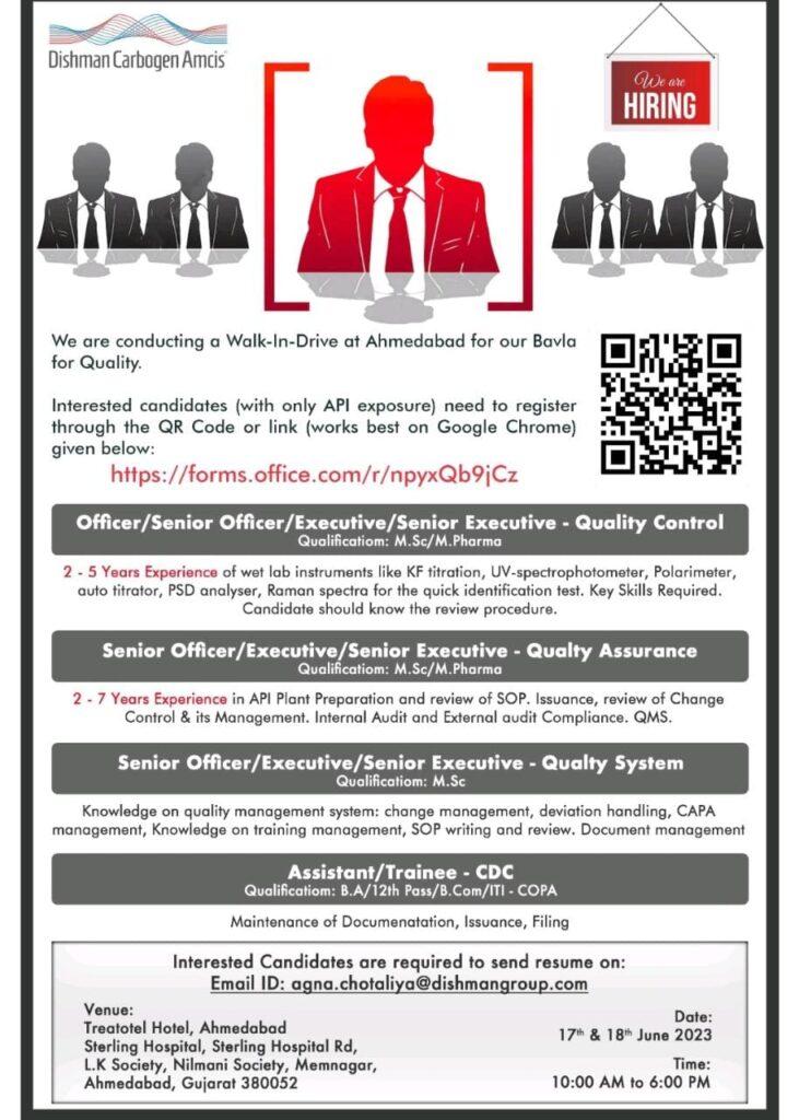 Dishman Carbogen Amcis Walk in Interview on 17 & 18th June 2023