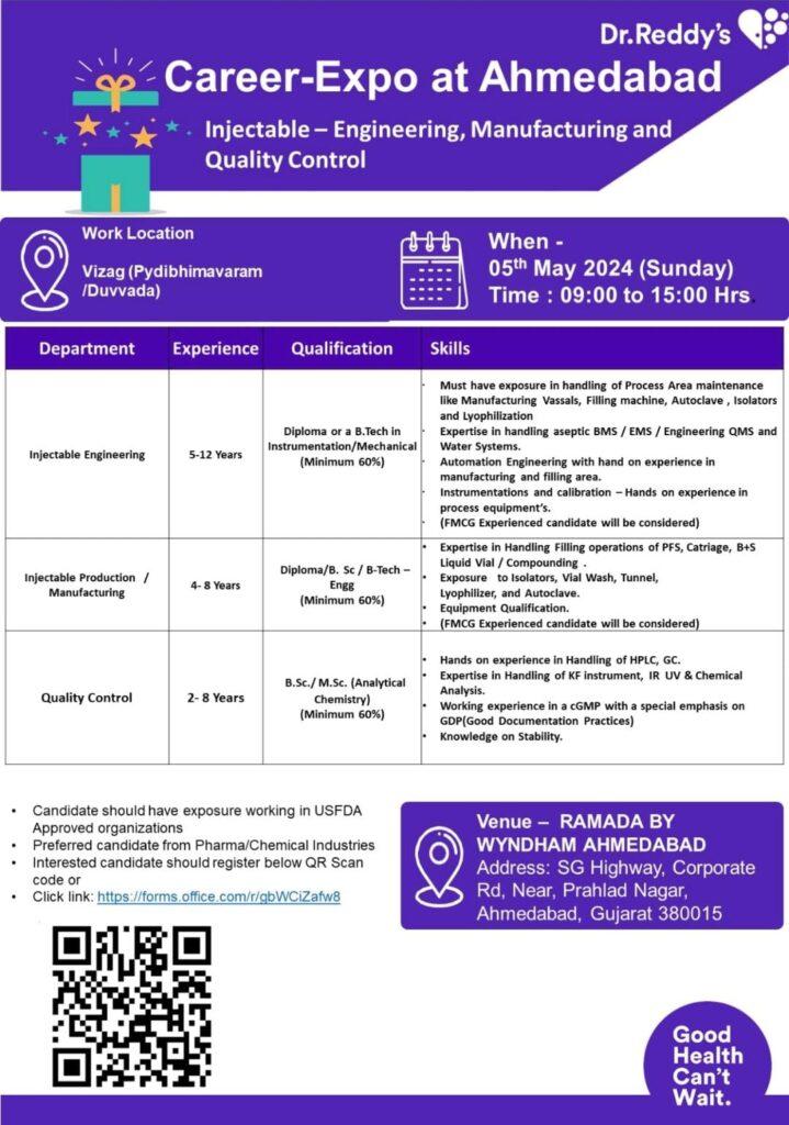 Dr.Reddy’s Career-Expo at Ahmedabad for Engineering, Manufacturing and Quality Control on 05th May 2024 (Sunday)