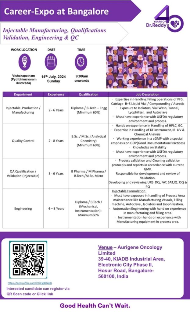 Dr.Reddy’s Career Expo for Injectable Manufacturing, Qualifications, Validation, Engineering & QC in Bangalore on 14th July 2024