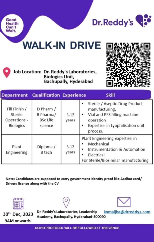 Dr Reddy’s Hiring Drive- 30th Dec 2023