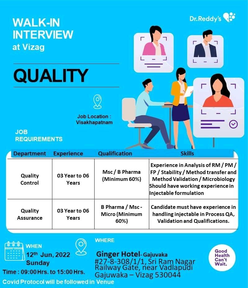 Dr. Reddy’s Laboratories, Vizag Walk In Interview for Quality Control, Quality Assurance on 12th Jun, 2022 Sunday