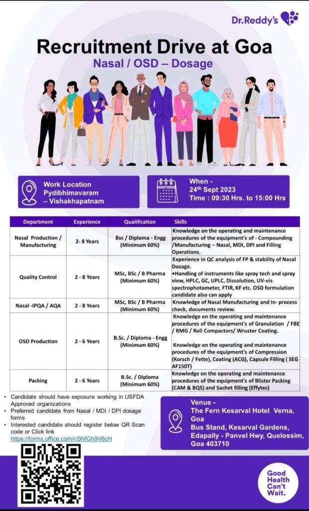 Dr. Reddy’s laboratories Walk In Drive on 24th Sept 2023 for Nasal Production/ Manufacturing, Quality Control, Nasal-IPQA/AQA, OSD Production, Packing department