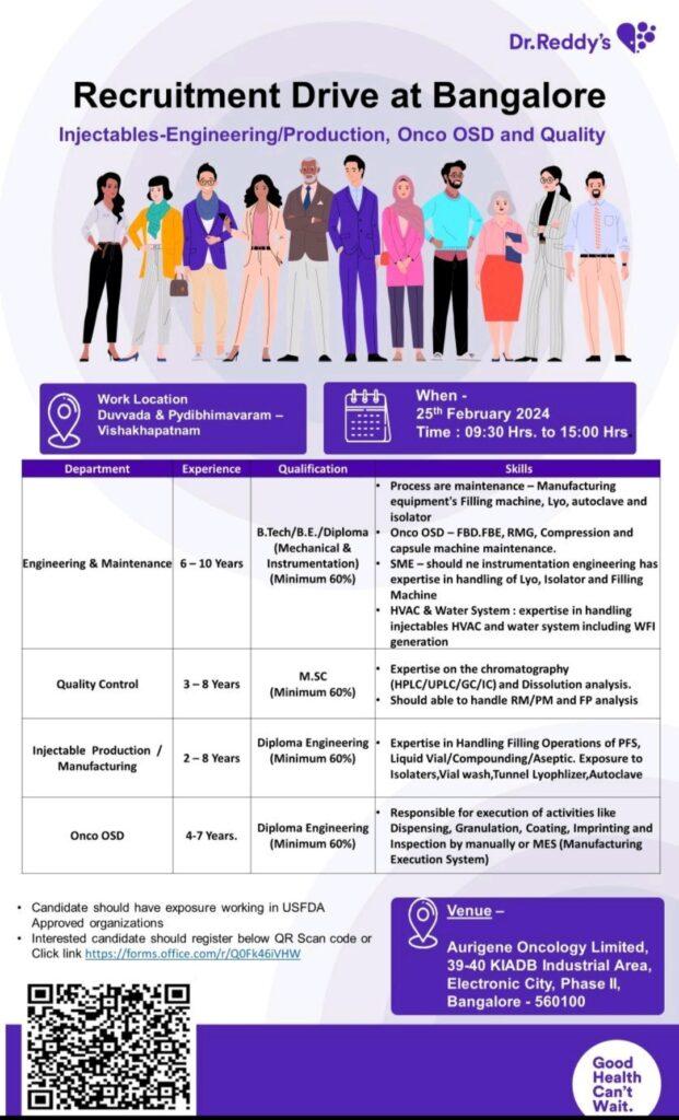 Dr Reddys – GMO FTO Sterile Recruitment Drive at Bangalore on 25th Feb 2024