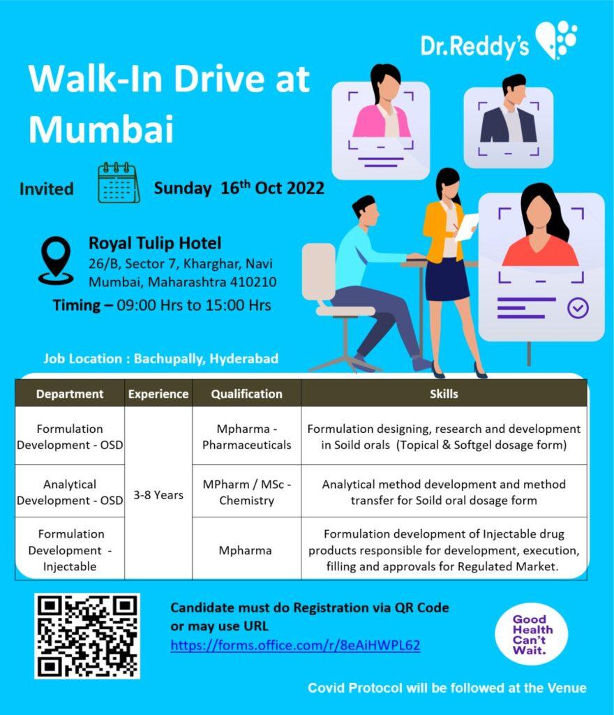 Dr.Reddy’s Walk-In Drive at Mumbai for multiple R&D positions based in Bachupally Hyderabad on 16th Oct 2022