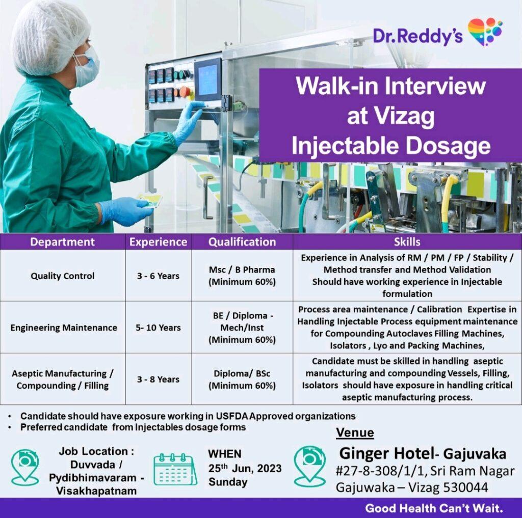 Dr. Reddy’s Walk-in Interview at Vizag for Aseptic Manufacturing/ Compounding / Filling/ Quality Control/ Engineering Maintenance on 25th Jun, 2023 Sunday