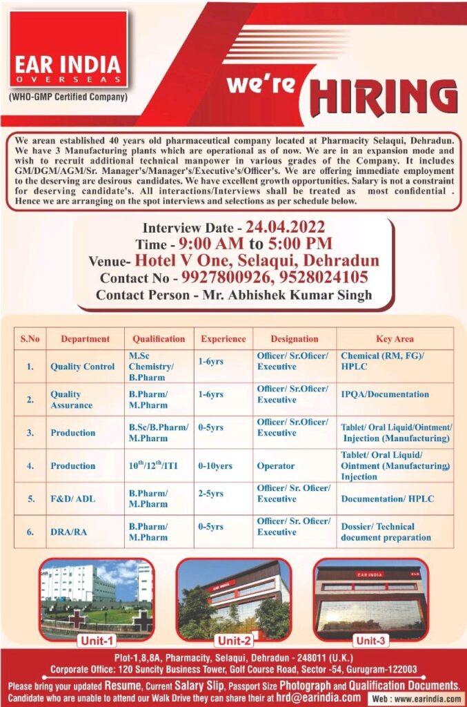 EAR INDIA OVERSEAS Walk In Interview for QA, QC, Production, ADL, F&D, DRA, RA on 24th April 2022