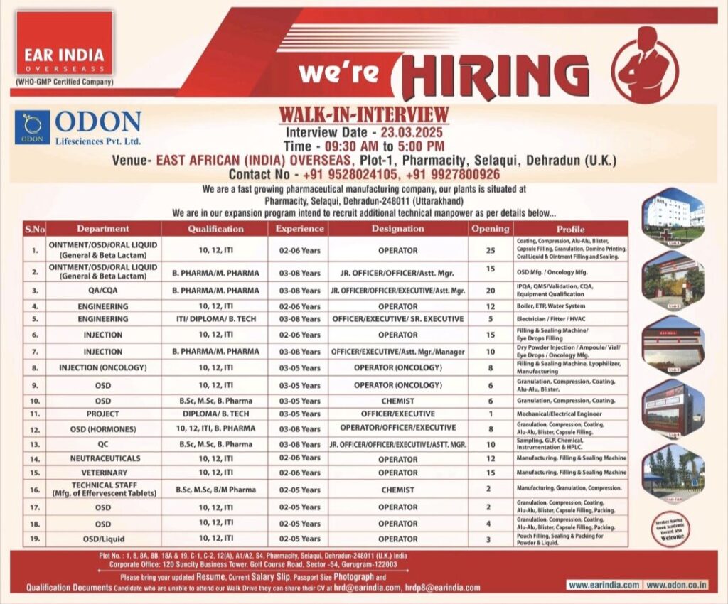 Candidates who are unable to attend our Walk-In Drive can share their CV at hrd@earindia.com, hrdp8@earindia.com