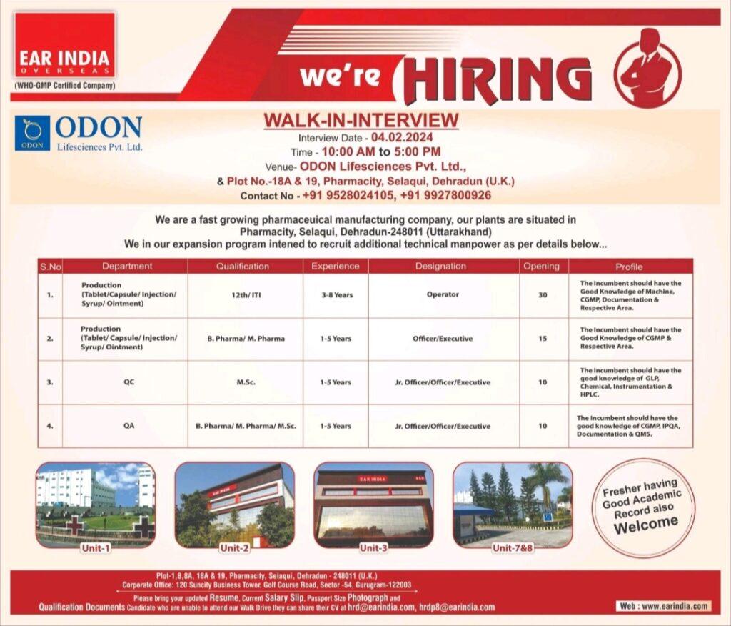 We are a fast growing pharmaceuical manufacturing company, our plants are situated in Pharmacity, Selaqui, Dehradun-248011 (Uttarakhand) We in our expansion program intened to recruit additional technical manpower as per details below…