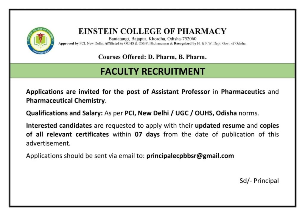 Einstein College of Pharmacy, located at Baniatangi, Bajapur, Khordha, Odisha, has announced openings for the post of Assistant Professor in Pharmaceutics and Pharmaceutical Chemistry. The college, approved by the Pharmacy Council of India (PCI), New Delhi, and affiliated to OUHS & OSBP, Bhubaneswar, is recognized by the Health & Family Welfare Department, Government of Odisha.