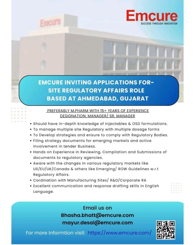 EMCURE hiring for Regulatory Affairs role based at Ahmedabad