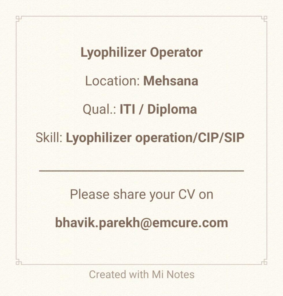 Emcure Pharma job vacancy for Lyophilizer & Injectable – Plant Operator || Apply Now