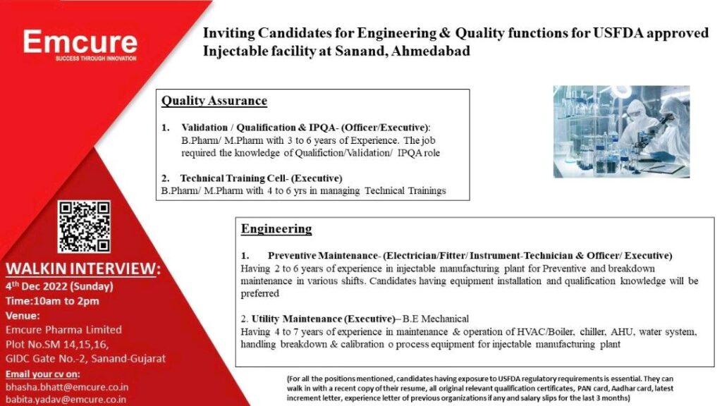 Emcure Pharma Walk In Interview for Engineering/ Quality Assurance on 4th Dec 2022