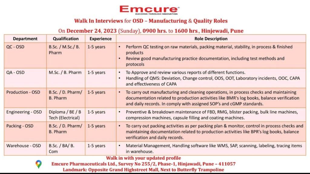Interested candidates can Walk in with their updated profiles on Sunday, December 24, 2023 at Emcure Pharmaceuticals Limited, Survey No 255/2, Phase -1, Hinjawadi, Pune – 411057 Landmark: Opposite Grand Highstreet Mall