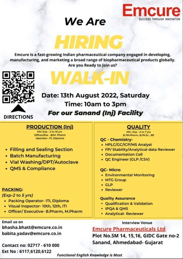 Emcure Pharmaceuticals Ltd Walk In Interview for Quality Assurance, QC-Chemistry, QC-Chemistry, Production & Packing department on 13th August, 2022
