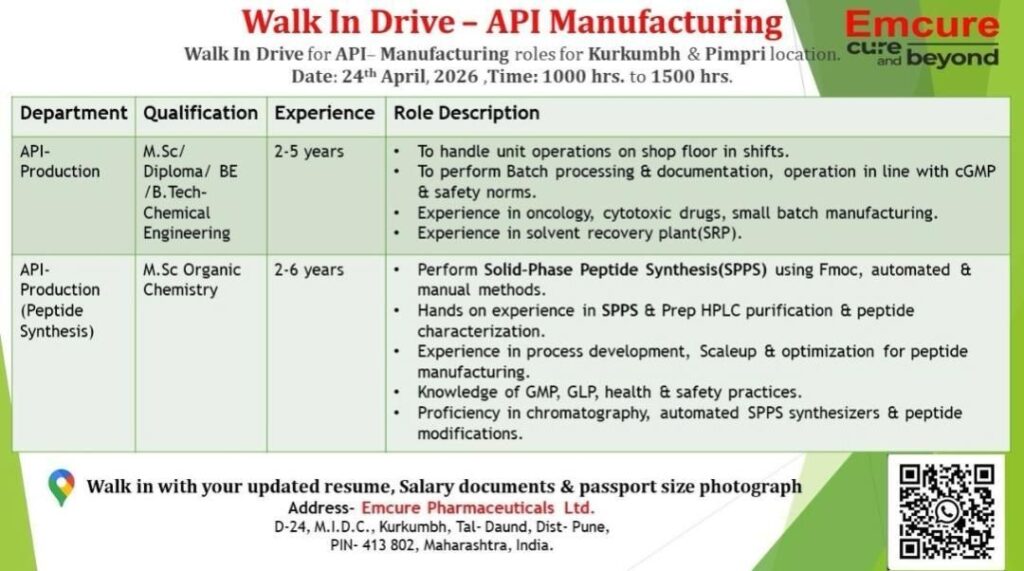 Emcure Pharmaceuticals has announced an upcoming Walk-In Drive for specialized roles in API Manufacturing. This recruitment event is targeting experienced professionals for their Kurkumbh and Pimpri locations, offering a significant opportunity for those looking to advance their careers in the pharmaceutical sector.