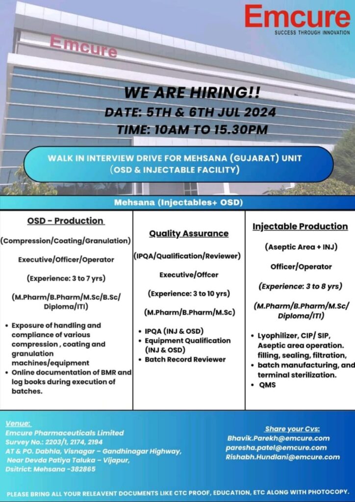 Emcure Pharmaceuticals walk in interview for (Injectables+ OSD) Production & Quality Assurance on 5th & 6th July 2024