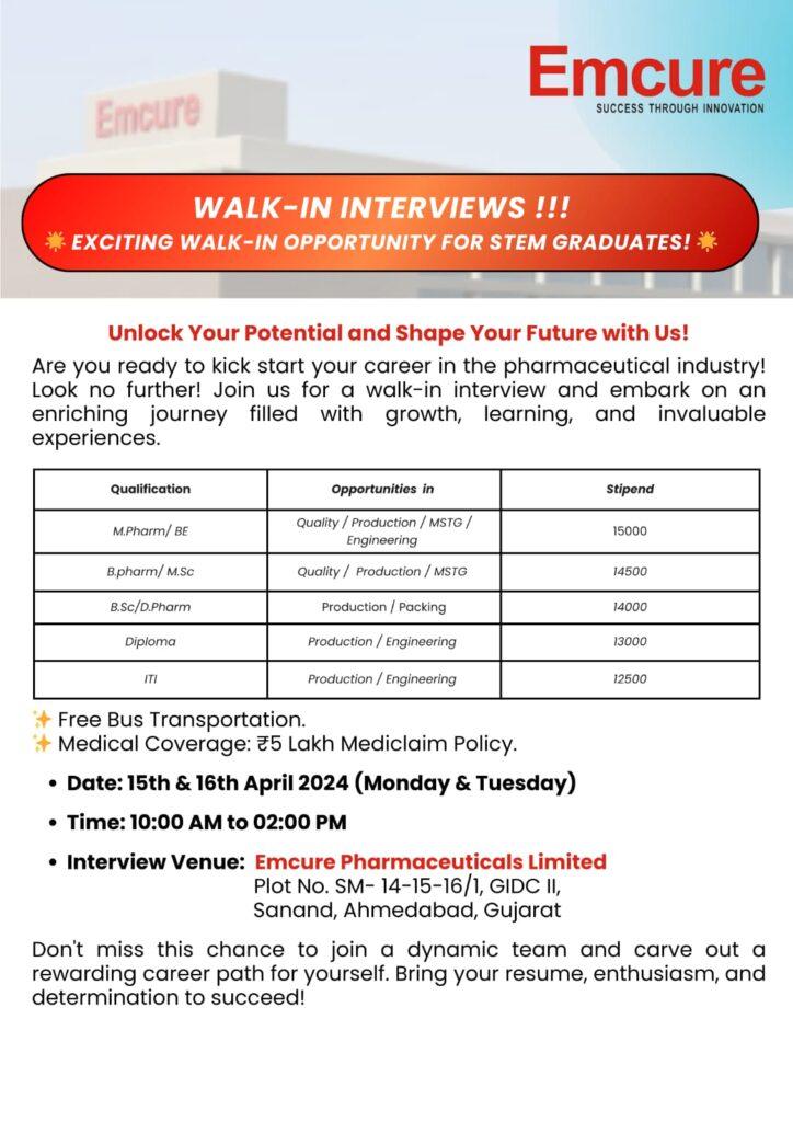 Interview Venue: Emcure Pharmaceuticals Limited Plot No. SM-14-15-16/1, GIDC II, Sanand, Ahmedabad, Gujarat.