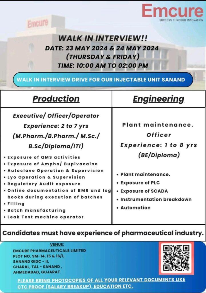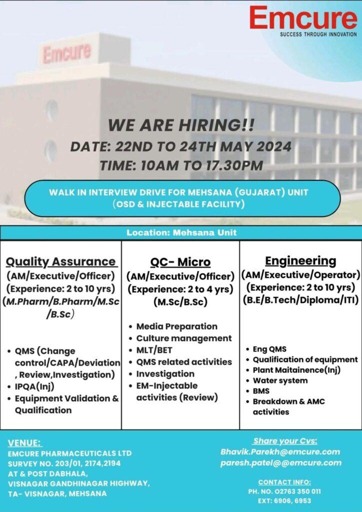 EMCURE walk in interview drive for QA, QC-Micro, Production & Engineering on 22nd to 24th May 2024