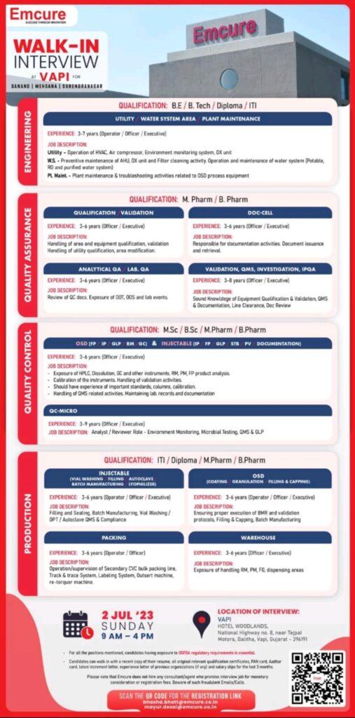Emcure Walk in Interview for QA, QC, QC micro, Production Packing & Warehouse on 2nd July 2023