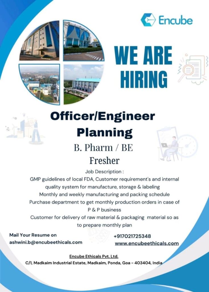 Encube Ethicals Pvt. Ltd., a leading pharmaceutical company specializing in dermatology and topical formulations, has announced an exciting job opportunity for fresh graduates. The company is inviting applications for the position of Officer/Engineer – Planning at its manufacturing facility located in Madkaim Industrial Estate, Ponda, Goa.