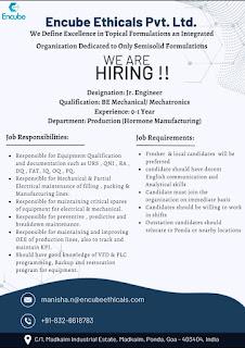 Encube Ethicals Pvt. Ltd. job vacancy for Jr. Engineer in Production department |0-1 Year
