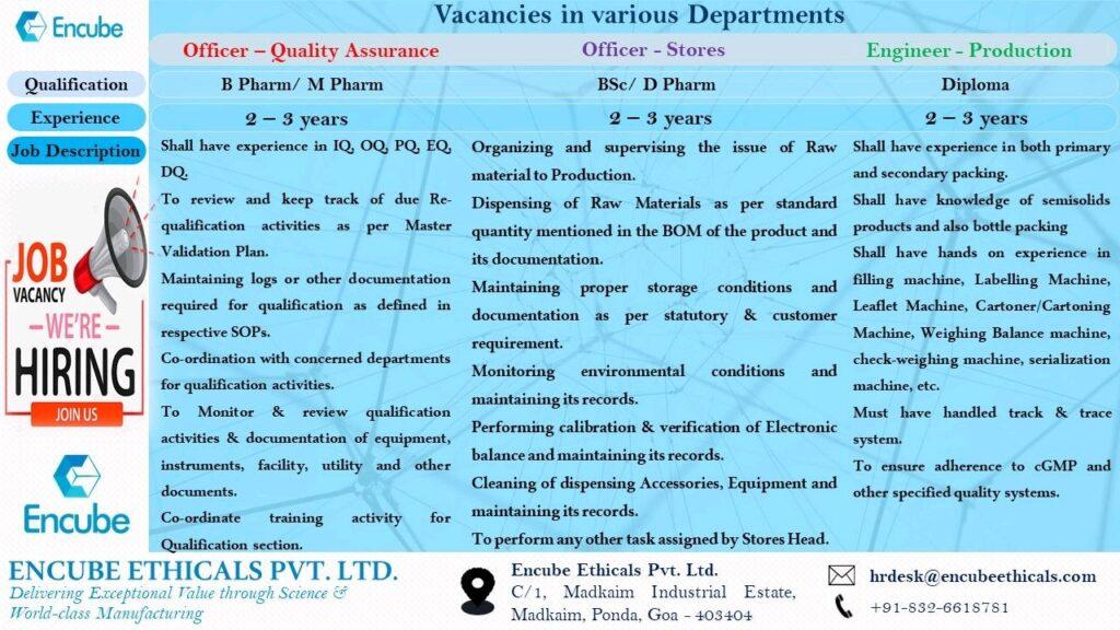 Encube Ethicals Pvt. Ltd. Vacancies in QA, Stores (RM/PM) & Engineering department