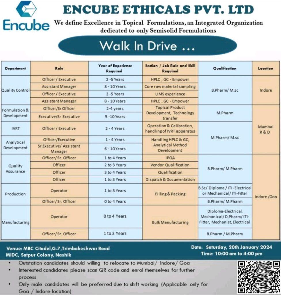 ENCUBE ETHICALS Walk In Drive QA, QC, Production, Manufacturing, Analytical Development, Formulation & Development, IVRT on 20th January 2024