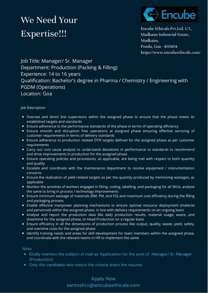 Encube hiring for the position of Manager/ Senior Manager-Production department at Goa