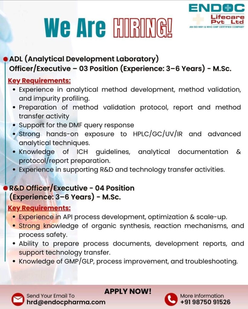 Endoc Lifecare Pvt. Ltd., an ISO 9001 & WHO GMP–certified pharmaceutical company, has released a new hiring announcement for skilled professionals in Analytical Development Laboratory (ADL) and Research & Development (R&D) departments. This is a great opportunity for M.Sc-qualified candidates with 3–6 years of experience who are looking to build a strong career in the pharma industry.