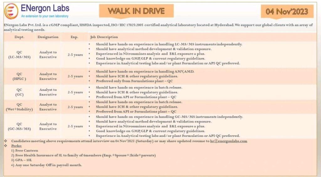 Energon Labs Pvt. Ltd. Walk in interview for multiple job vacancy in QC (LC-MS/MS/ HPLC/ GC/ Wet+Stability/ GC-MS/MS) | 04th Nov 2023 (Saturday)