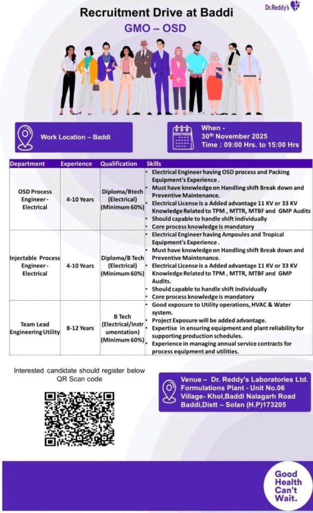 Dr. Reddy’s Laboratories is hosting a dedicated Recruitment Drive in Baddi for talented and experienced engineering professionals to join its GMO – OSD (Oral Solid Dosage) division. If you are an electrical, instrumentation, or utility engineering expert, this is a prime opportunity to advance your career with a leading pharmaceutical company.