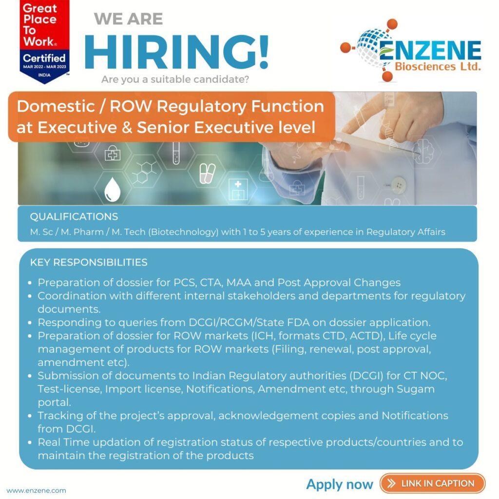 Enzene Biosciences Ltd. Hiring for Domestic/ROW Regulatory Function at Executive & Senior Executive level – Apply Now