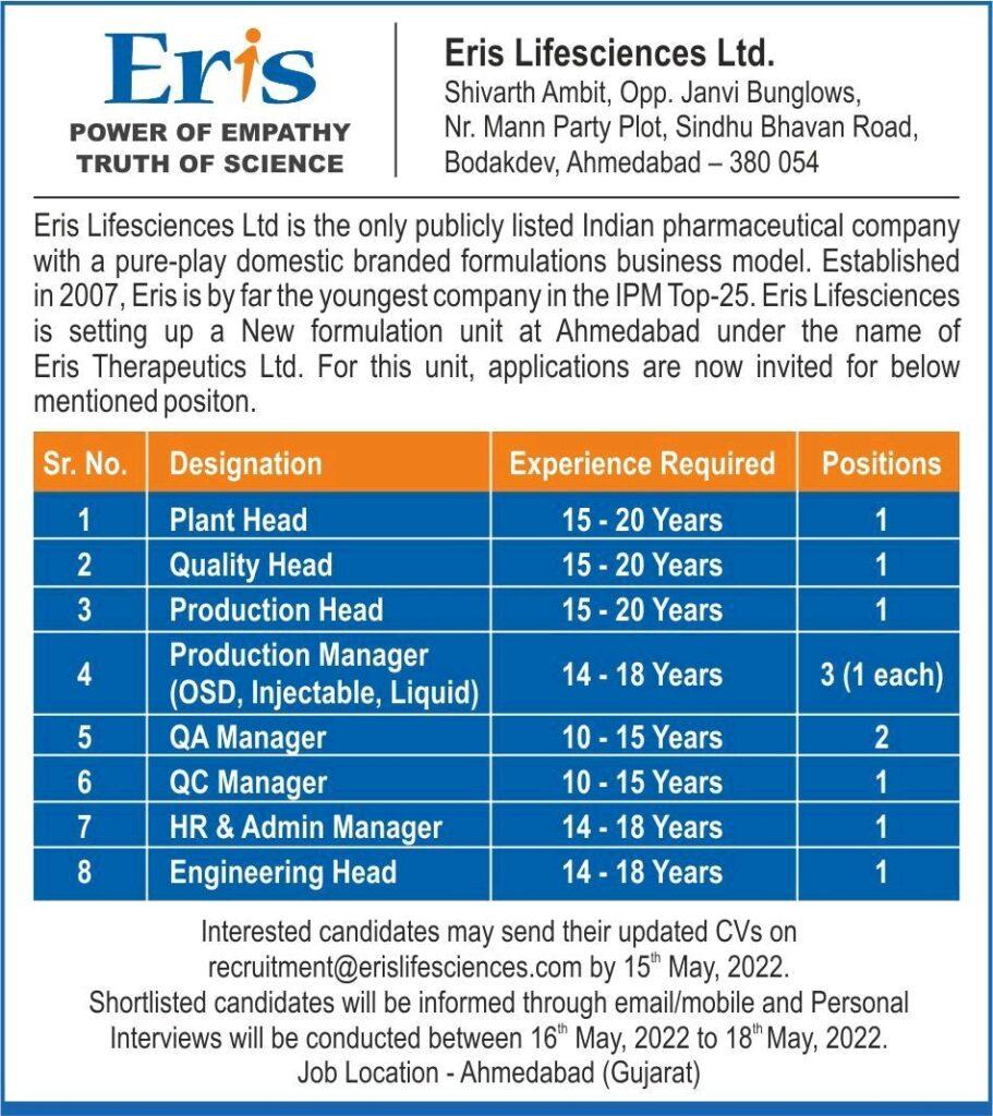 Eris Lifesciences Ltd looking for Plant Head, Quality Head, Production Head, Production Manager, QA Manager, QC Manager, HR & Admin Manager, Engineering Head || Apply Now