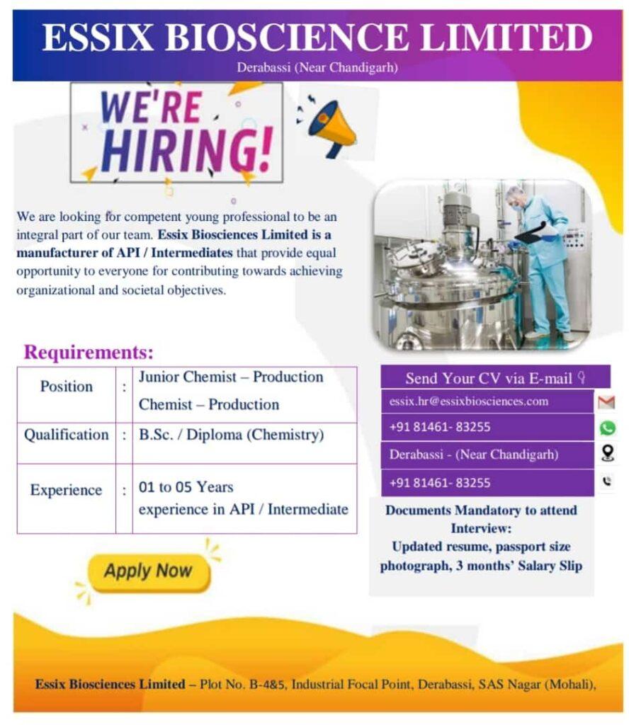 Essix Biosciences Limited hiring for Junior Chemist, Chemist – Production department