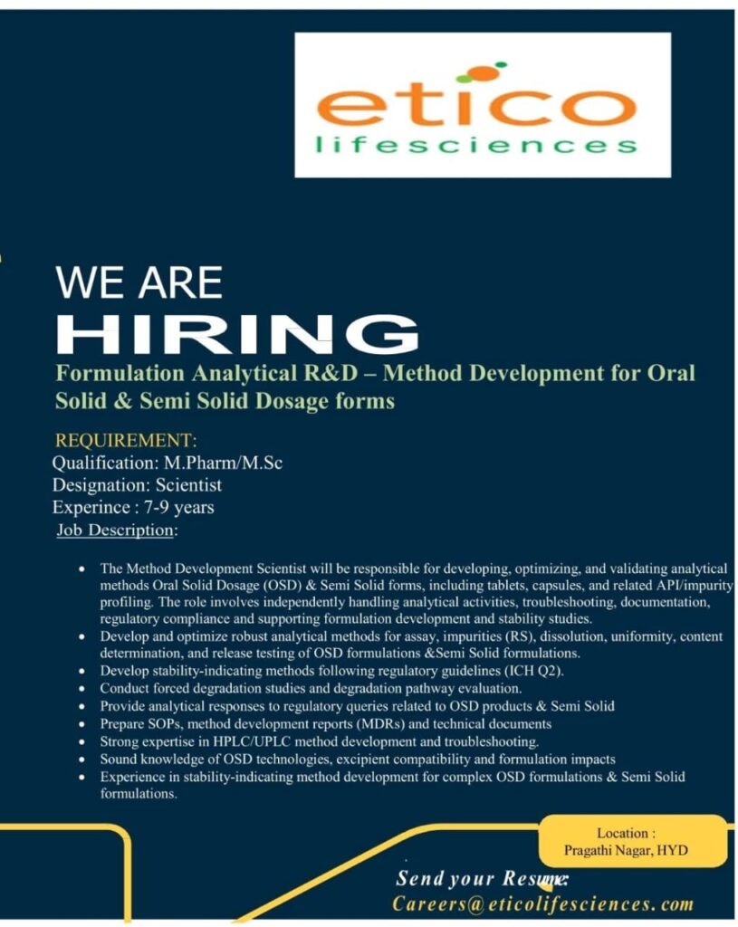 Etico Lifesciences has released an exciting career opportunity for experienced professionals in the pharmaceutical research domain. The company is currently hiring for the position of Scientist – Formulation Analytical R&D (Method Development) specifically focused on Oral Solid and Semi-Solid Dosage Forms. The position is based in Pragathi Nagar, Hyderabad.