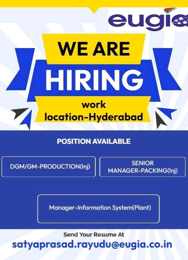 Eugia hiring for DGM/ GM/ Manager/ Sr.Manager- Production, Packing & Information System(Plant) apply now