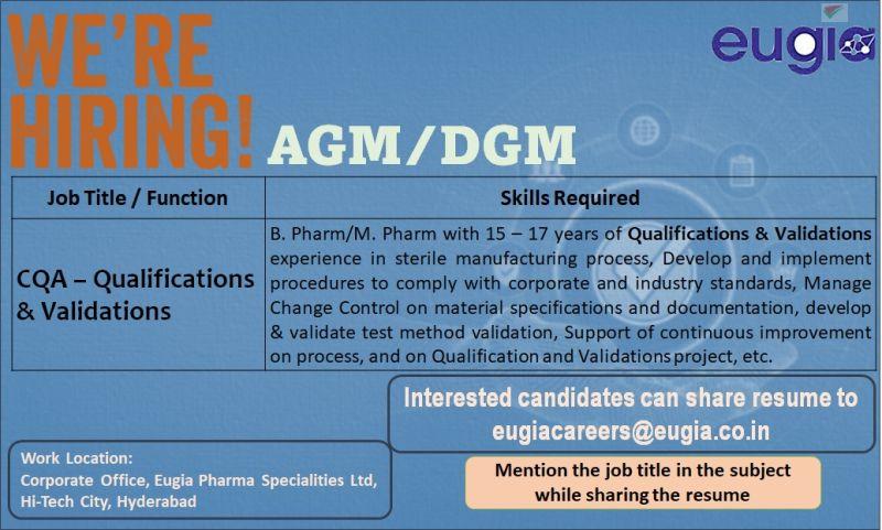 Eugia Pharma hiring for AGM/DGM- CQA – Qualifications & Validations