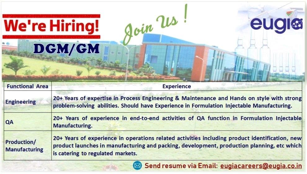 Eugia Pharma hiring for DGM/GM in QA, Production/ Manufacturing & Engineering department