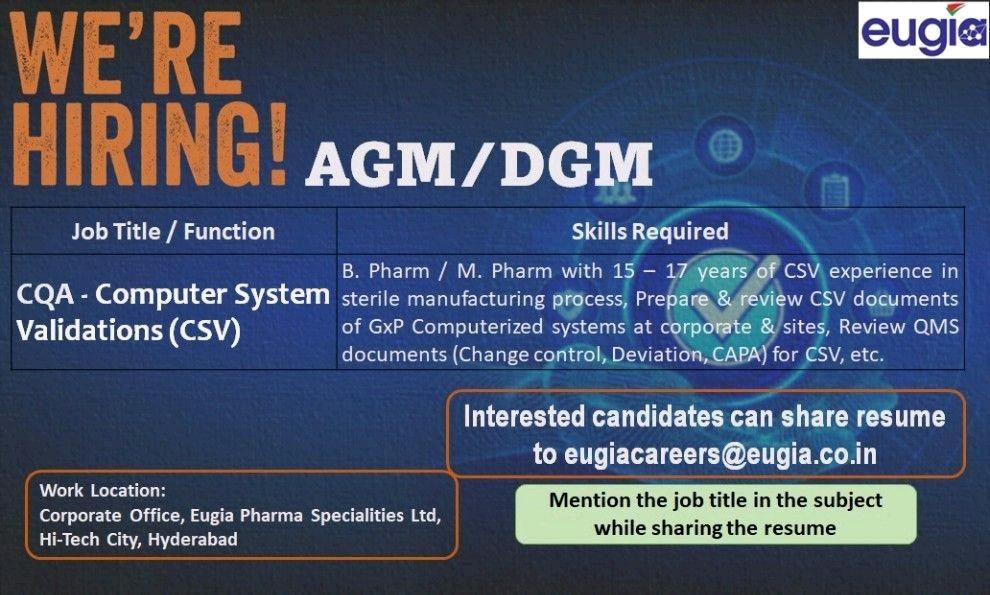 Eugia Pharma Specialitiesugia hiring AGM/DGM -CQA – Computer System Validations