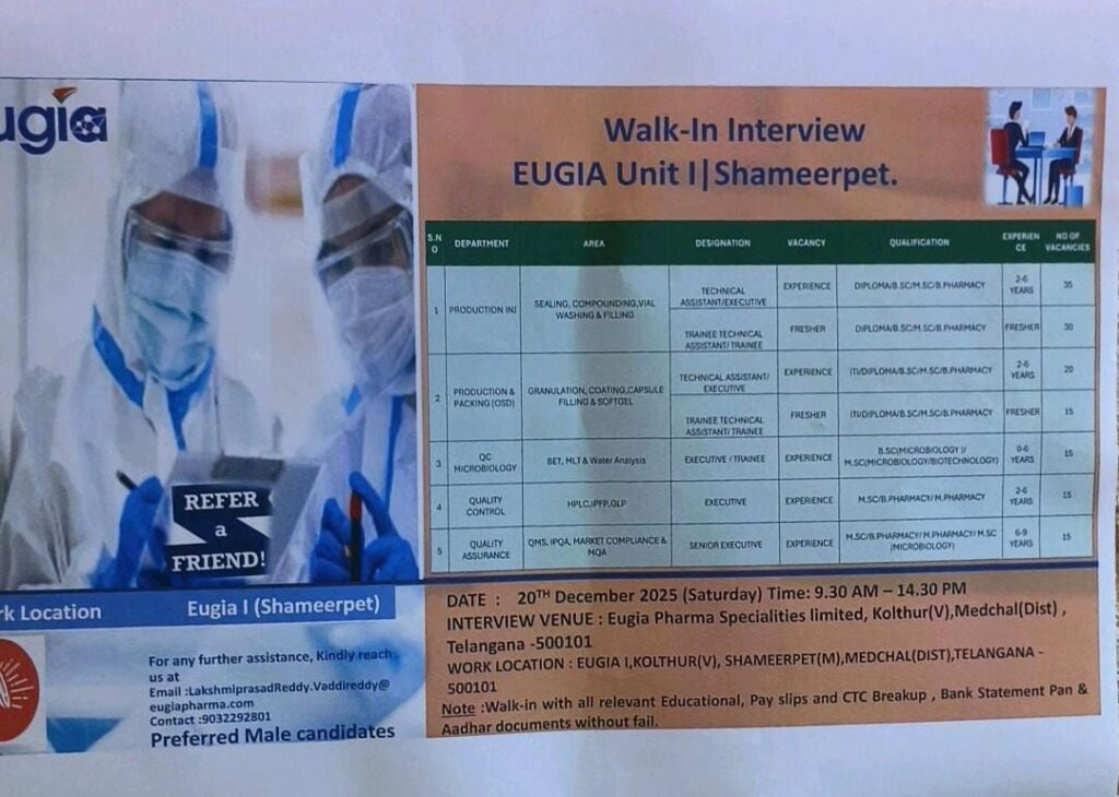 - Interview Venue: Eugia Pharma Specialities Limited, Kolthur(V), Medchal(Dist), Telangana – 500101.