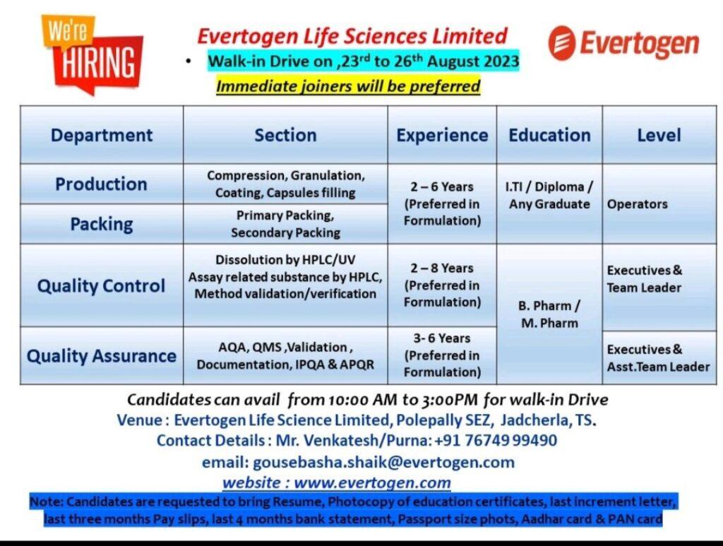 Evertogen Life Sciences Limited Walk In Drive on 23rd to 26th August 2023 | Production, Packing, Quality Control, Quality Assurance