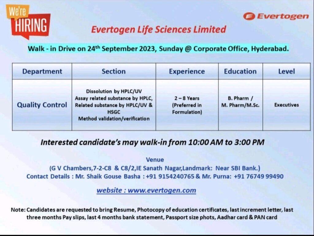 Evertogen Life Sciences Limited Walk In Drive on 24th September 2023 for Quality Control department