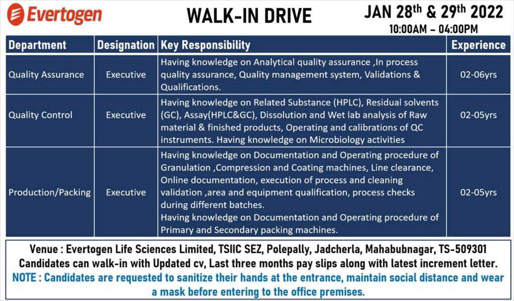 Evertogen Life Sciences, Walk-In Drive for Production / Quality Assurance & Quality Control on 28th & 29th Jan’ 2022